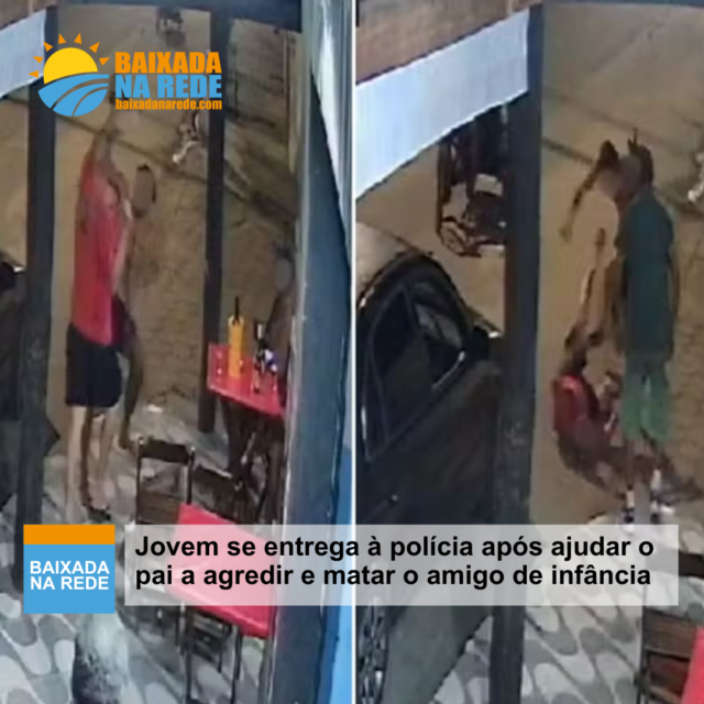 O jovem de 19 anos que, junto com o pai, de 52, agrediu e matou um comerciante em frente ao próprio bar em Itanhaém, no litoral de São Paulo, se entregou à polícia. O agressor chuta a vítima e foge. O pai dele foi preso horas depois do crime.