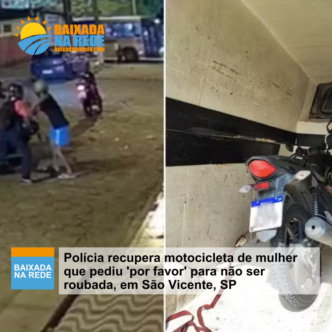 A Polícia Civil recuperou a motocicleta de uma mulher que foi filmada sendo roubada, em São Vicente, na Baixada Santista, e pediu ‘por favor’ para que os bandidos não levassem o veículo. Embora tenham apreendido e devolvido o automóvel à vítima, os agentes não conseguiram prender os criminosos, que fugiram novamente.