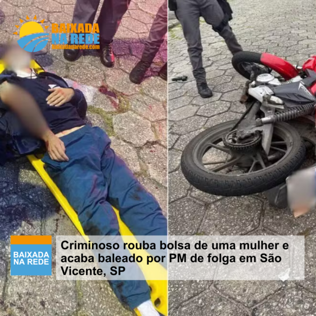 Um homem, de 35 anos, rouba bolsa de uma mulher e acaba baleado no cotovelo direito por um policial militar de folga em São Vicente, na Baixada Santista. O assaltante foi preso em flagrante após o caso.