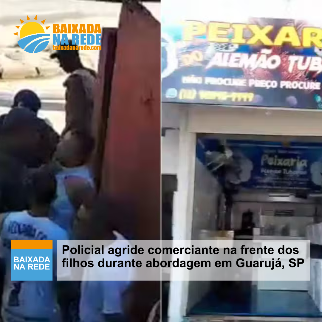Um comerciante, de 38 anos, foi agredido e xingado por um policial militar durante uma abordagem na frente dos filhos em Guarujá, na Baixada Santista. Em nota, a Polícia Militar (PM) informou que os agentes envolvidos foram afastados e serão investigados.