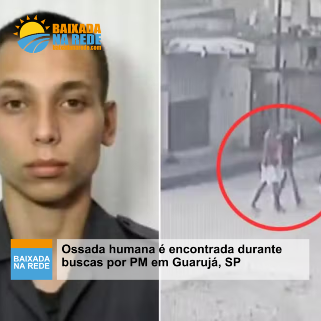 Uma ossada humana foi encontrada por policiais na Vila Baiana, em Guarujá, na Baixada Santista. O esqueleto foi localizado durante as buscar pelo policial militar Luca Romano Angerami, que está desaparecido há 10 dias.
