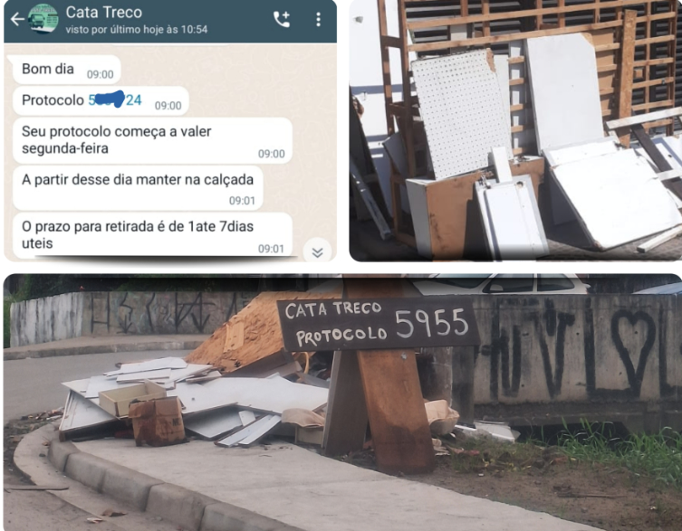 Veja print enviado por um morador, o serviço de cata-treco estipula um prazo de 1 (um) a 7 (sete) dias para a realização da coleta do entulho.