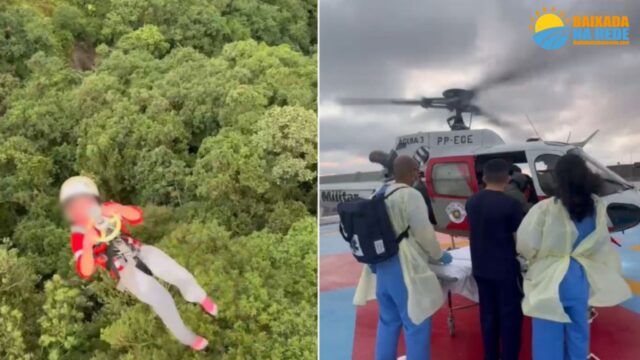 Uma menina de 6 anos foi resgatada por um helicóptero da Polícia Militar em uma cachoeira de Cubatão (SP) após sofrer queimaduras no rosto, mãos e pés em um acidente envolvendo gasolina. A criança estava com os pais em uma área de mata, mas a dinâmica do incidente não foi divulgada. O Corpo de Bombeiros acionou a PM, que enviou uma equipe da Base de Aviação de Praia Grande para o local, na Cachoeira Escondida, em Paranapiacaba. Devido à gravidade das queimaduras, a menina foi içada pelo guincho do helicóptero e levada ao Hospital das Clínicas, em São Paulo, para tratamento. Os pais foram retirados da área por via terrestre.