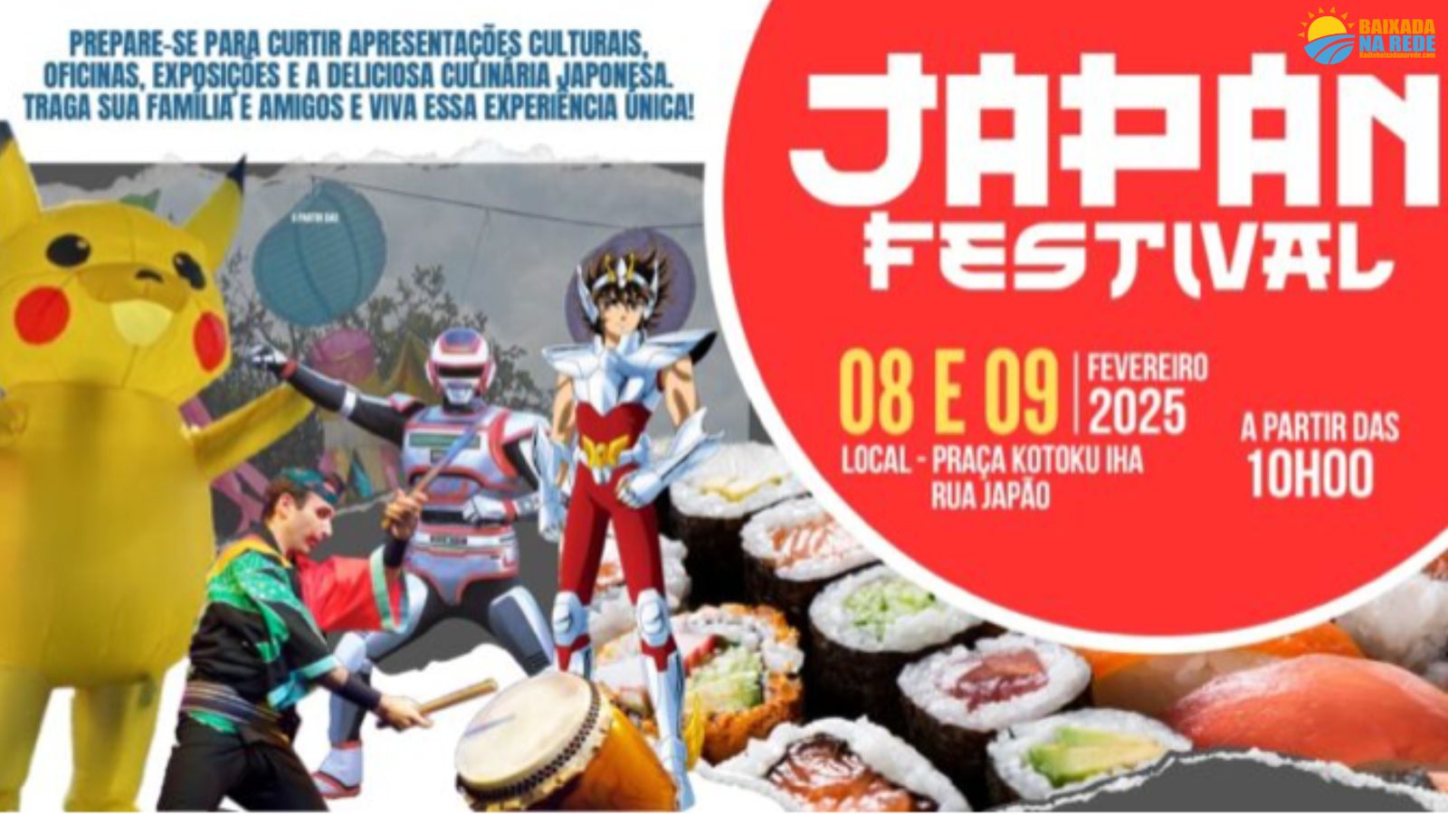 Nos dias 8 e 9 de fevereiro, a partir das 10h, acontece em São Vicente o Japan Festival, com entrada totalmente gratuita. O evento será realizado na Rua Japão, na Praça Kotoku Iha, em comemoração aos 130 anos de amizade entre Brasil e Japão. O evento é uma iniciativa do vereador Jhony Sasaki, em parceria com a Prefeitura Municipal de São Vicente, o festival promete uma programação diversificada.