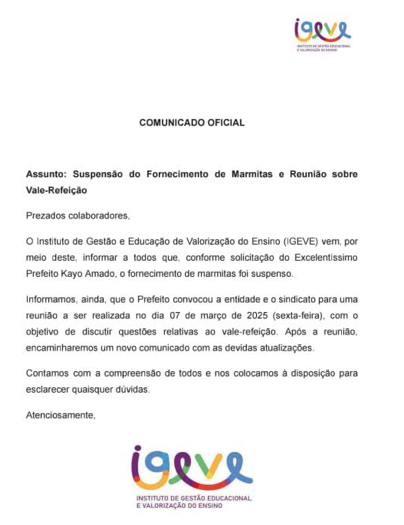 A empresa IGEVE comunicou aos seus colaboradores que, a partir de 1º de março de 2025, os empregados deixarão de receber o auxílio alimentação na modalidade de vale-refeição, seja em espécie (dinheiro) ou por meio de cartão. Em substituição, a empresa passará a fornecer marmitas gratuitamente aos seus funcionários.