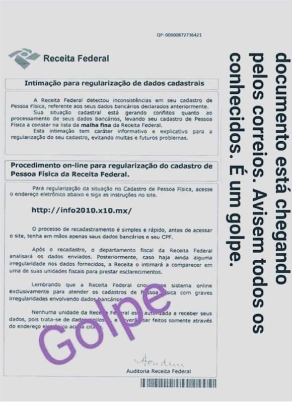 Essas correspondências físicas, enviadas pelos Correios, simulam uma comunicação oficial e pedem para que o contribuinte forneça dados pessoais e bancários. Como se proteger? Desconfie de qualquer correspondência que solicite acesso a sites desconhecidos ou a regularização de dados. Nunca forneça informações pessoais fora dos canais oficiais da Receita Federal.