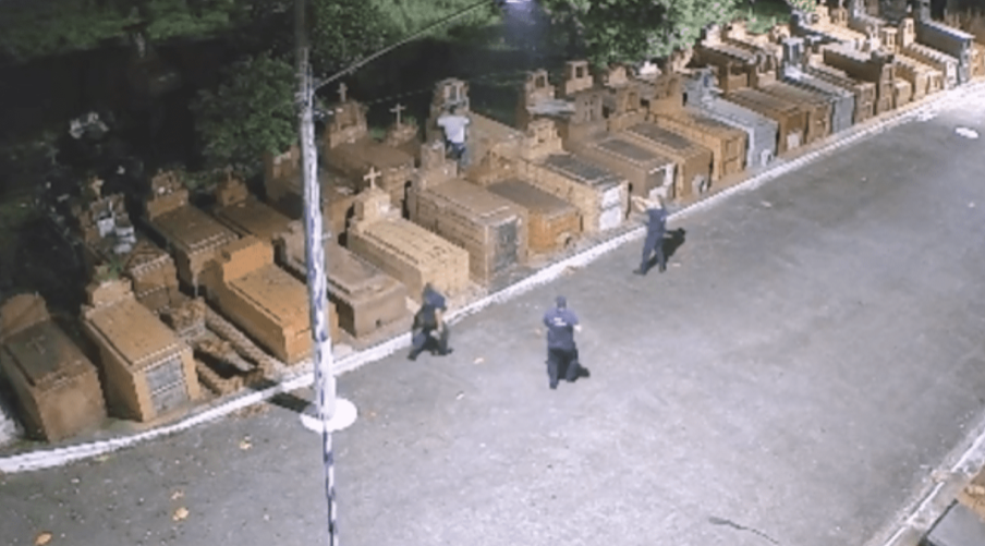 Dois homens foram detidos por invadir o Cemitério da Areia Branca, em Santos, no litoral paulista, na noite de quinta-feira (20). O alarme de segurança disparou quando os suspeitos escalaram o portão, acionando o Centro de Controle Operacional (CCO), que alertou a Guarda Civil Municipal (GCM). Com o auxílio das câmeras de segurança, os guardas impediram que os invasores furtassem qualquer material e apreenderam dois alicates com a dupla. O caso foi registrado como dano ao patrimônio público na Central de Polícia Judiciária de Santos.