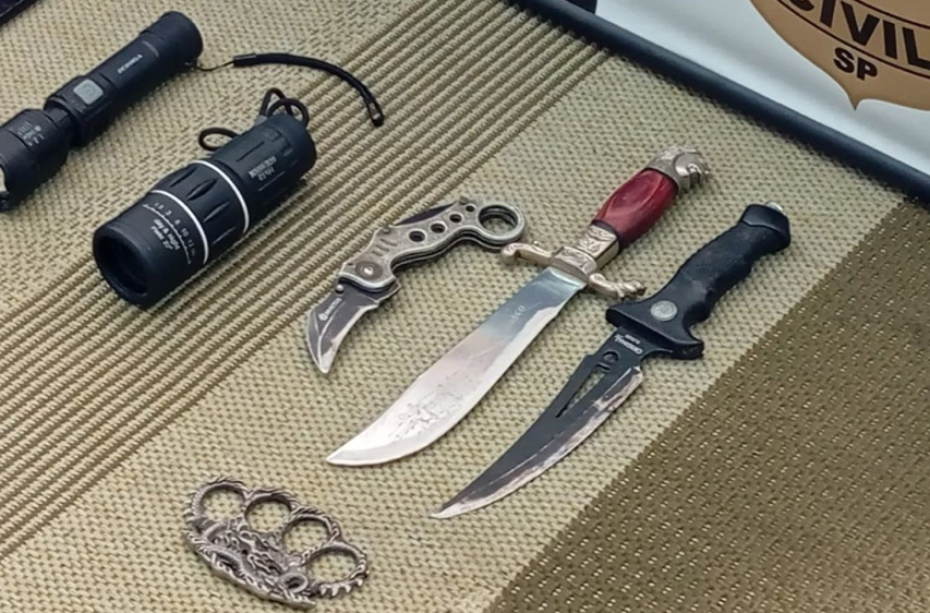 A Polícia Civil apreendeu armamentos e uma revista sobre psicopatas com um casal preso após manterem uma criança e dois adolescentes em cárcere privado e com alimentação insuficiente por mais de dois anos em Registro, SP. Os suspeitos, o pai de 37 anos e a madrasta de 20, devolveram os filhos para a avó após a denúncia e a visita de conselheiros tutelares e policiais.