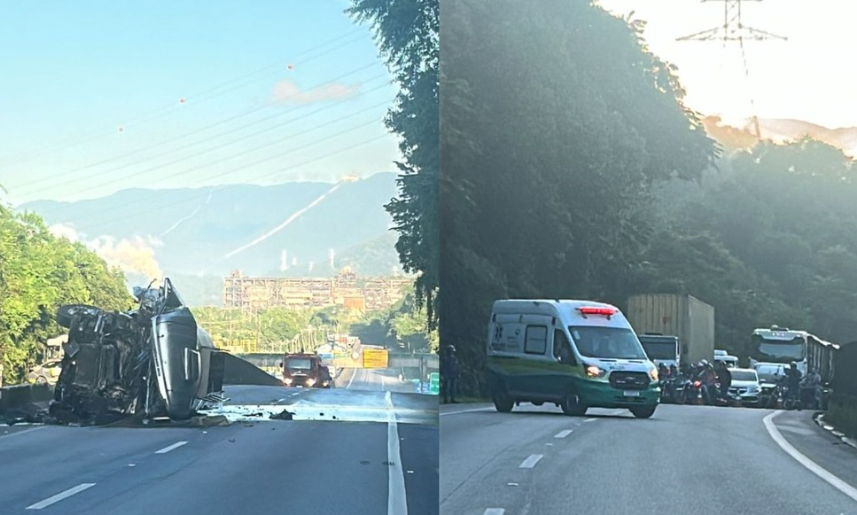 Um caminhão-tanque carregado com etanol tombou na manhã desta terça-feira (15) na Rodovia Cônego Domênico Rangoni, em Cubatão (SP), causando derramamento de combustível e bloqueio nos dois sentidos da via por risco de explosão. O motorista relatou ter “apagado” ao volante e perdido o controle. Cerca de 50% da carga vazou, e equipes especializadas, incluindo a Cetesb, atuam no local para conter danos ambientais e realizar o transbordo seguro do produto restante.