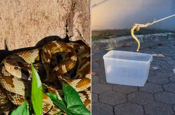 Uma jararaca foi resgatada no estacionamento de um mercado em Guarujá, no litoral de SP. Os guardas do Grupamento de Defesa Ambiental (GDA), da Guarda Civil Municipal (GCM), foram acionados para atender a ocorrência. Os agentes capturaram o animal que tinha aproximadamente um metro, logo após, ela foi solta em região afastada de mata no Morro da Barra.