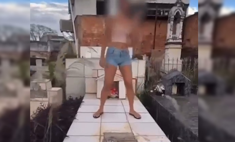 Duas adolescentes causaram polêmica ao postar nas redes sociais um vídeo em que dançam sobre um túmulo no Cemitério Municipal de Pirenópolis (GO). Enquanto uma delas realiza a dança e debocha das homenagens póstumas, a outra grava as imagens, que começaram a viralizar nesta terça-feira (13). Em tom de ironia, a jovem ainda comenta: “Ah não, por favor! Se eu morrer, vocês não colocam um trem desse no meu túmulo”. O vídeo também mostra fotos de pessoas sepultadas no local, e em outro trecho, as adolescentes fazem piada com o nome de uma mulher homenageada.