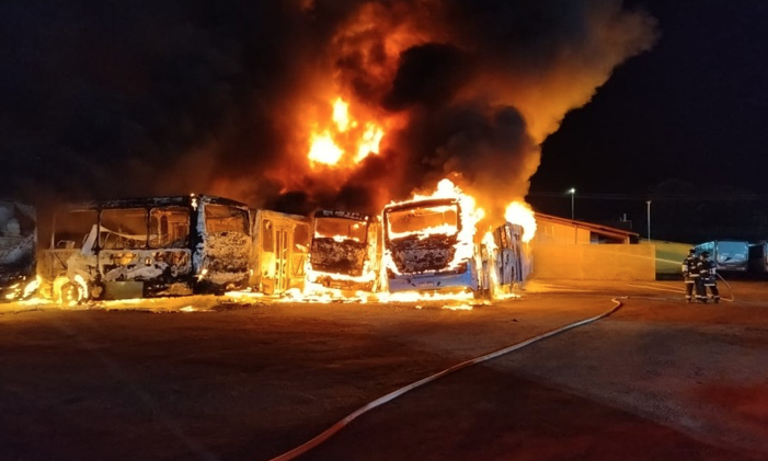 Um incêndio destruiu 17 ônibus na madrugada desta segunda-feira (19) em Caraguatatuba, no Litoral Norte de SP. As chamas começaram por volta das 2h e atingiram a garagem de uma empresa de transporte público no bairro Porto Novo. Entre os veículos destruídos, 15 eram destinados ao transporte escolar de São Sebastião e 2 operavam em linhas regulares.