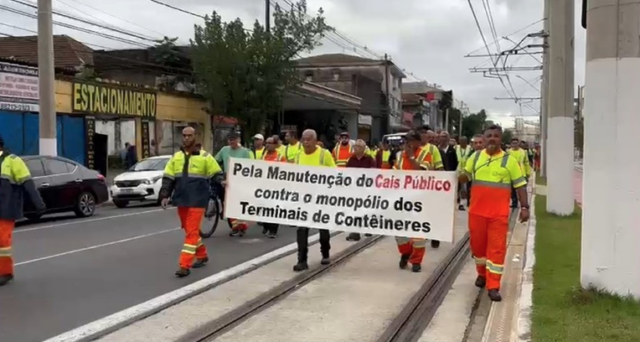 Estivadores protestam por melhorias no cais público e contra PL 733 em Santos SP