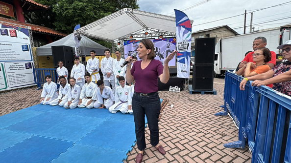 A Praça Kotoku Iha, localizada na Rua Japão, foi tomada por energia e diversão neste domingo (8) com a realização do evento Rua Olímpica Radical. A programação contou com diversas atrações que animaram o público presente, começando com as apresentações dos convidados do projeto social do vereador Jhony Sasaki. As atividades tiveram início com uma exibição de karatê do Higa Dojo, comandada pelo sensei Lucas, seguida por uma apresentação de afromix. O evento também contou com a presença da deputada federal Rosana Valle, responsável por viabilizar o projeto no município.