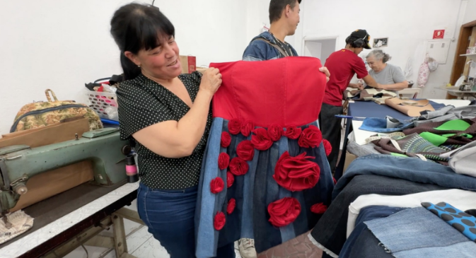 A gente quer apresentar esse novo conceito, que é o reuso de roupas boas e ainda bem conservadas. E, claro, vamos fazer um belo desfile pra vocês! Além da feira de artesanato, também vamos apresentar as peças feitas pelas nossas alunas.