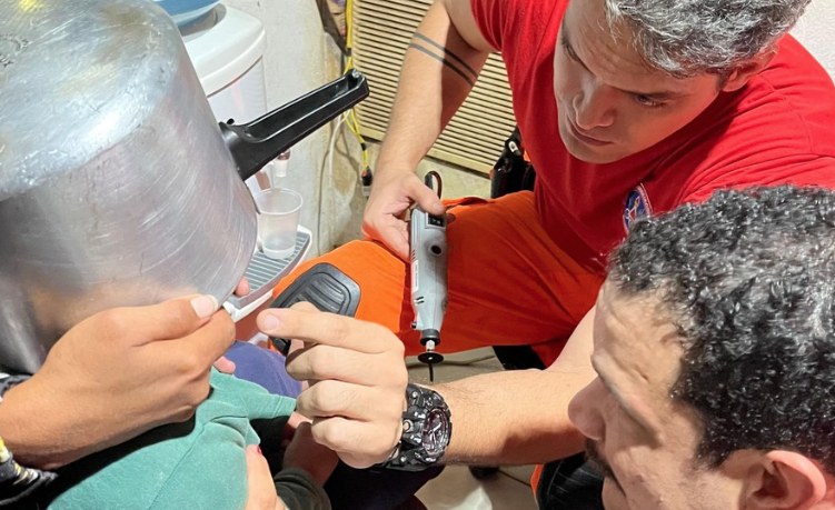 Em Campos Altos, no Alto Paranaíba, um menino de 2 anos foi levado ao Posto Avançado do Corpo de Bombeiros com uma panela de pressão presa na cabeça. A avó, de 37 anos, acompanhou a criança e também não soube explicar como o incidente doméstico aconteceu. Os bombeiros que atuaram no resgate foram o cabo Bruno Mendes Palhares Reis e o sargento Nilton Neto. Para acalmar o menino durante o procedimento, os militares contaram curiosidades sobre o caminhão dos bombeiros, mantendo a criança tranquila. O cabo Bruno descreveu a situação como “inusitada” ao se deparar com a cena. Apesar do susto, a retirada da panela foi bem-sucedida e o menino não sofreu ferimentos.