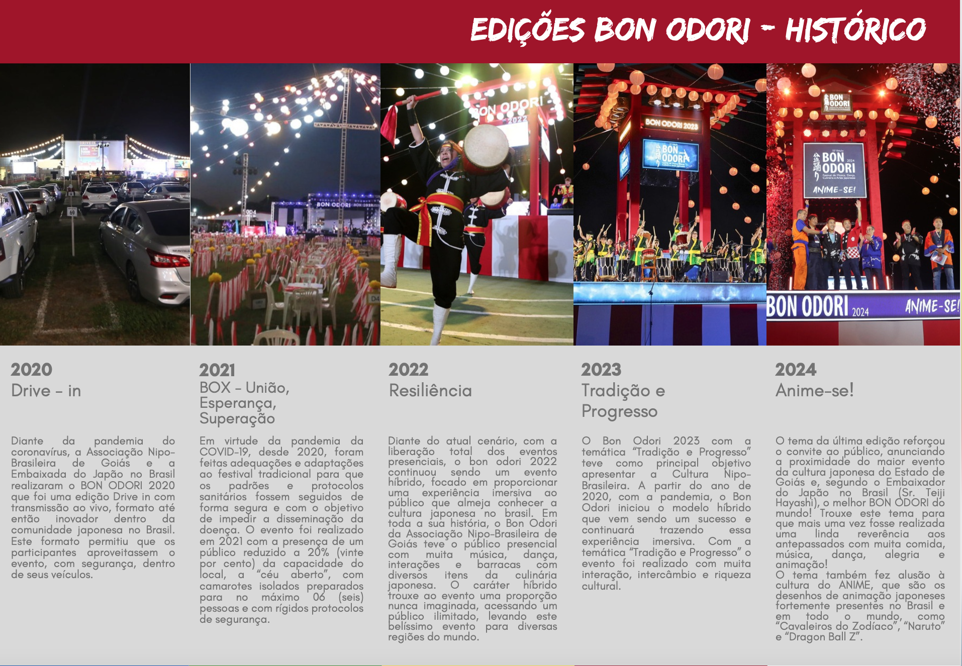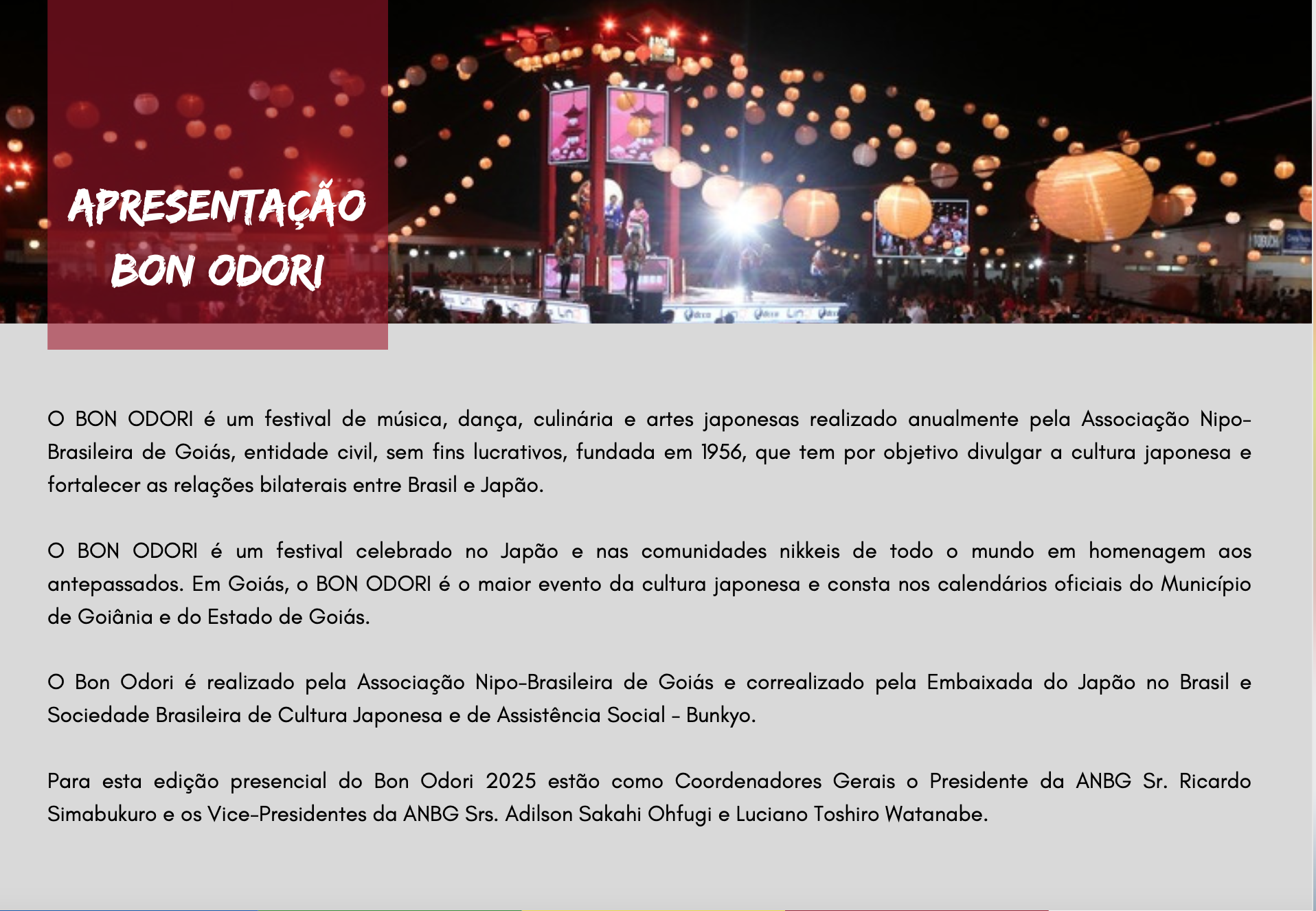 O Bon Odori de Goiás é mais do que um festival: é um ponto de encontro entre gerações, culturas e histórias. Reconhecido por autoridades japonesas como a maior do mundo, o evento reafirma o compromisso da comunidade nipo-brasileira com a preservação de suas tradições e o fortalecimento dos laços entre Brasil e Japão. Mais informações clique no link FESTIVAL BON ODORI