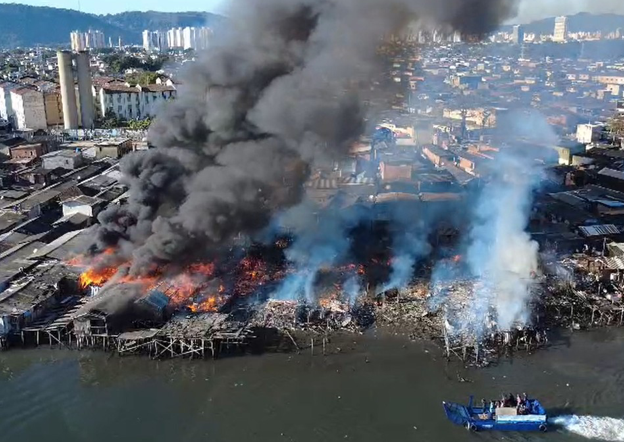 Incêndio de grandes proporções atingi moradias construídas sobre palafitas na comunidade Caminho São Sebastião, em Santos, no litoral de SP, nesta sexta-feira (1). Segundo a Defesa Civil do Estado de São Paulo, cerca de 100 moradias foram destruídas pelo fogo e uma pessoa morreu e outras ficaram feridas.