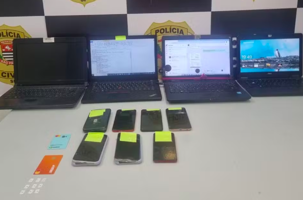 Um apartamento de luxo em Praia Grande, no litoral de São Paulo, funcionava como “escritório do crime” para fraudes digitais. Cinco pessoas, três homens e duas mulheres, foram presas. A ação ocorreu após vigilância policial que flagrou parte do grupo em um veículo e levou à abordagem do imóvel, onde foram encontrados computadores ligados, sites institucionais abertos, celulares e chips prontos para uso. Um dos suspeitos estava escondido em um cômodo. Foram apreendidos quatro notebooks, sete celulares, oito chips e um carro.
