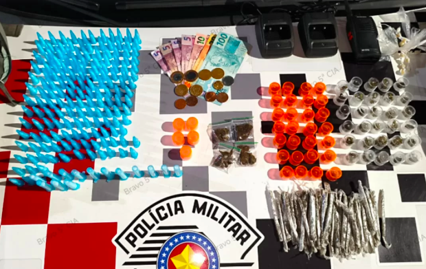 Na mochila, os PMs encontraram 215 porções de cocaína, 239 de maconha, e outros entorpecentes, também foram apreendidos um rádio transmissor e duas bases de carregamento.