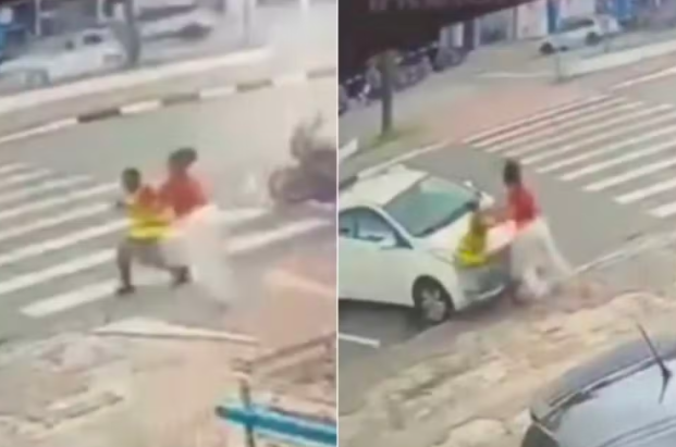 Nas imagens, é possível ver o suspeito usando um colete refletivo, ele passa pela vítima, que aguardava para atravessar a rua enquanto mexia no celular. Em seguida, ele retorna e tenta arrancar o aparelho de suas mãos. A mulher reage e inicia uma luta corporal, conseguindo imobilizar o homem até a chegada da Polícia Militar.