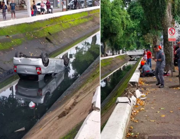 Uma motorista perdeu o controle do veículo e caiu no Canal 3, próximo ao cruzamento da Avenida Washington Luís com a Carvalho de Mendonça, em Santos, na manhã desta quarta-feira (19). Ela foi retirada do carro por pedestres antes da chegada do Corpo de Bombeiros e encaminhada consciente ao Pronto-Socorro. Duas viaturas e seis bombeiros atenderam a ocorrência. A vítima apresentava escoriações leves e recebeu atendimento inicial no local. Após o resgate, a área ficou sob responsabilidade da Polícia Militar e da CET-Santos.