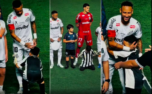 Menino de 6 anos viraliza ao beijar joelhos de Neymar antes de jogo do Santos.
