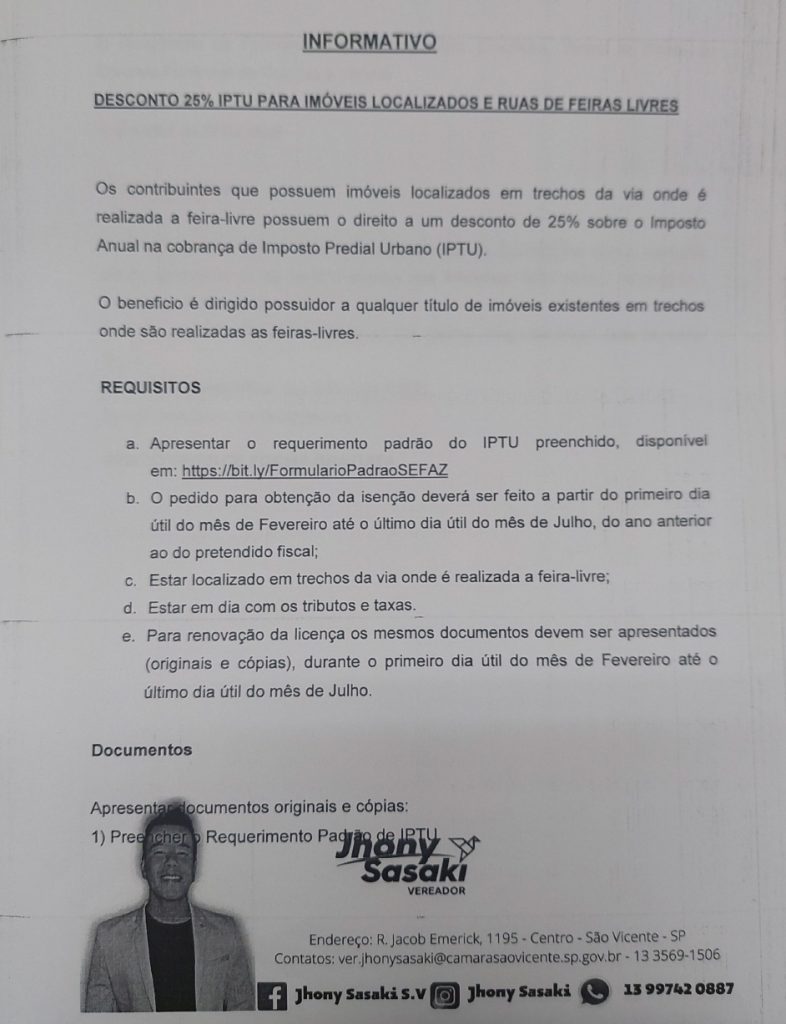 Na ultima sessão realizada no dia 2 de março na Câmara Municipal de São Vicente uma fala do vereador Jhony Sasaki, surpreendeu quem assistia a sessão. Jhony Sasaki, ressaltou o direito do desconto de 25% na taxa do IPTU aos cidadãos que moram em ruas onde acontecem as feiras livres da cidade. De acordo com o parlamentar muitas pessoas desconhecem esse direito e por isso não reivindicam. Para Mais informações clique neste link https://www.saovicente.sp.gov.br/desconto-de-iptu-para-feira-livre