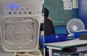 Aluna leva ar-condicionado portátil para escola durante onda de calor no...