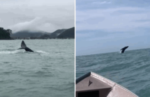 Mãe e filhote de baleia-jubarte são flagradas em praia do litoral...