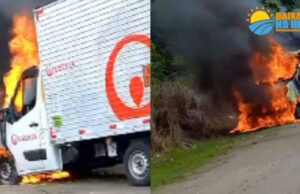 FURGÃO PEGA FOGO EM RODOVIA, NO LITORAL PAULISTA