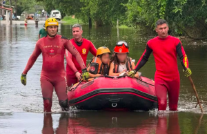 Equipes usam botes para resgatar pessoas em áreas alagadas de Peruíbe.