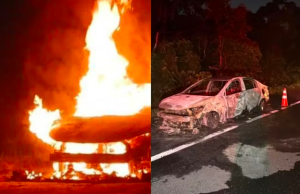 Carro pega fogo em rodovia do litoral de SP.