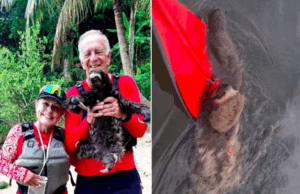 Canoístas resgatam bicho-preguiça à deriva no canal de Bertioga (SP).