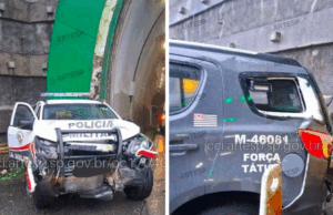 Viatura da PM fica parcialmente destruída após acidente na Imigrantes.