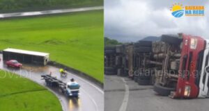 Carreta tomba e bate em mureta após fazer curva em Rodovia