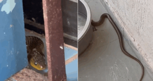 Moradores são surpreendidos por cobra no quintal de casa em Guarujá.