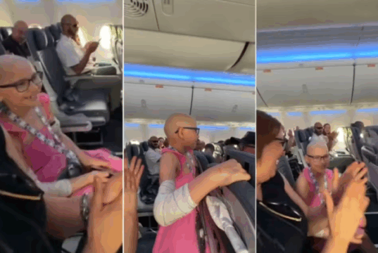 Menina supera câncer raro e comemora com a família dentro de avião.