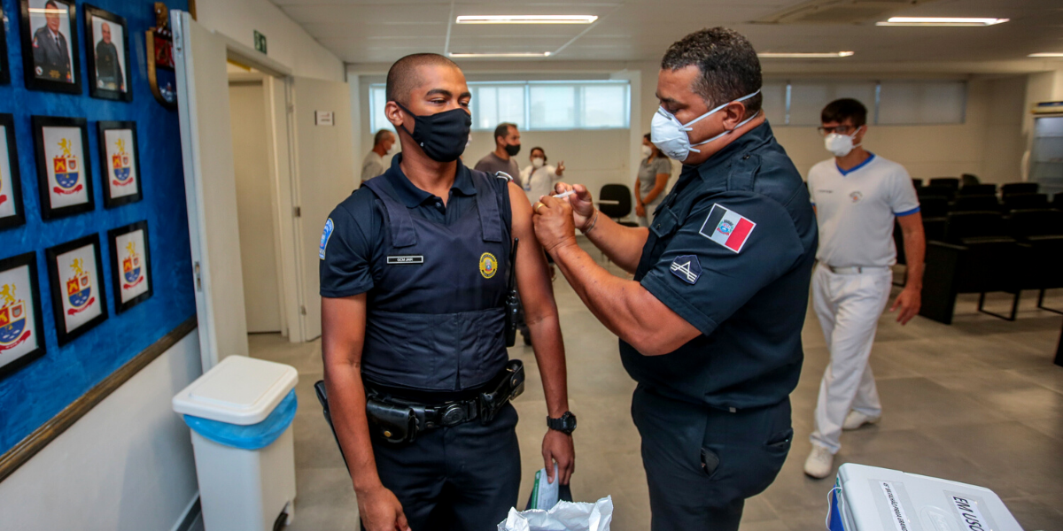 Profissionais da área de segurança vacinados contra Covid-19 em Praia Grande