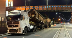 Caçamba de caminhão se solta, levanta e bate em passarela de...