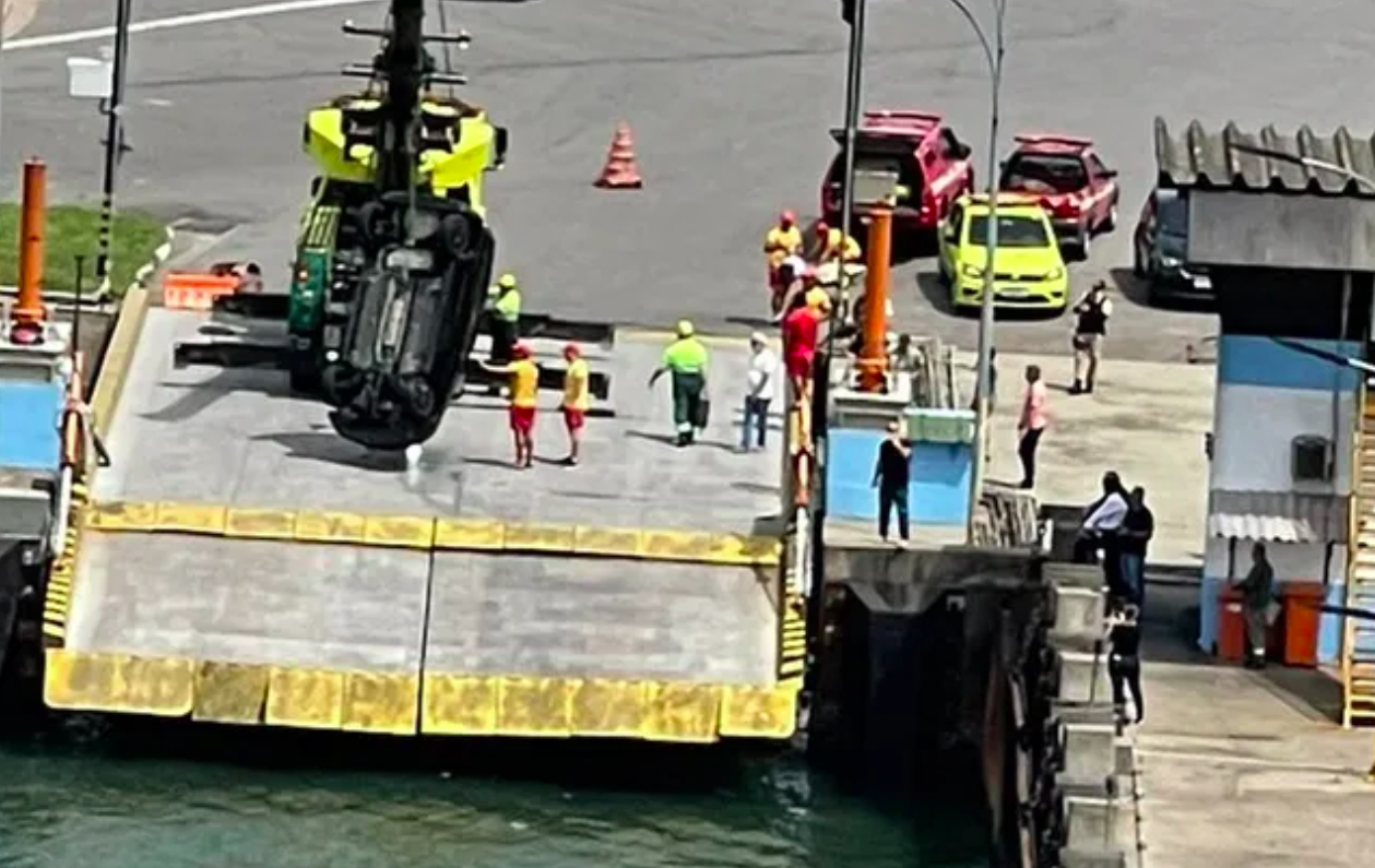 Condutor erra entrada da travessia de balsa e cai com carro...