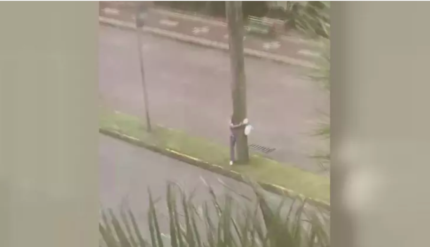 Homem se agarra em árvore para não ser levado por vento...