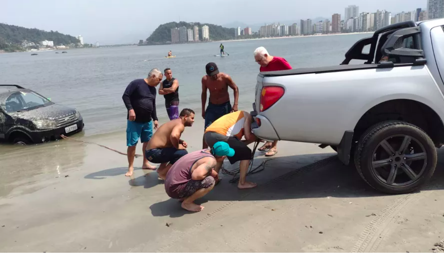 Carro atola em praia de São Vicente e mobiliza moradores em...