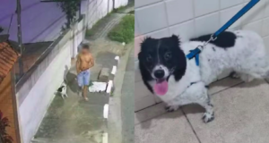 Homem abandona cachorro preso em poste, em São Vicente, SP