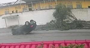 Veiculo capota depois de subir em calçada e bater em árvore