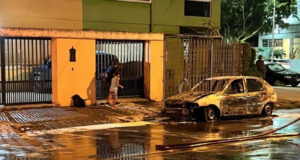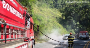 Carro é consumido pelas chamas e fica totalmente destruído em Santos,...