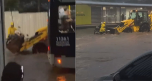 Motociclista é resgatado por retroescavadeira durante alagamento em BH