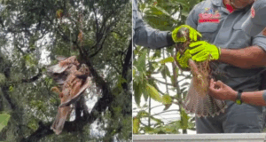 Gavião fica pendurado em árvore, após se prender em linha de...