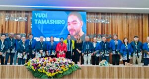 Vereador Jhony Sasaki entrega título de cidadão vicentino a Yudi Tamashiro.