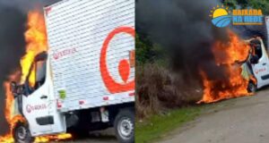 FURGÃO PEGA FOGO EM RODOVIA, NO LITORAL PAULISTA